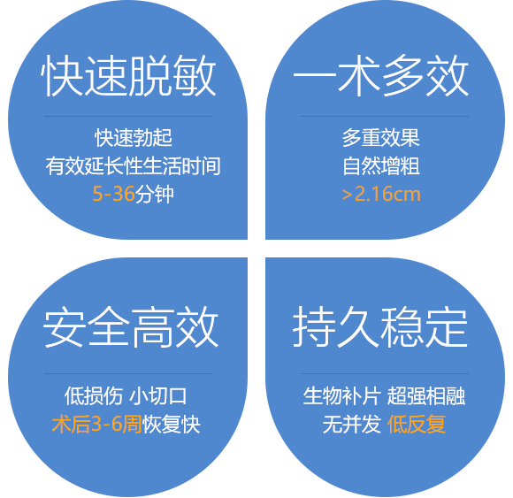 采用脱细胞专利技术培育脱细胞异体真皮组织,覆盖阴茎背神经上,4-6周诱导细胞长入相融,增加背神经上软组织厚度,有效隔离、快速勃起、 脱敏控射延时。